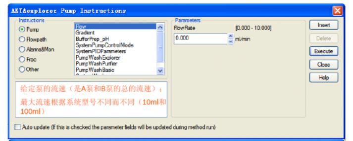 Fig 4、AKTA Explorer的泵清洗操作4、安裝層析柱在manual里選擇pump→flow rate,輸入一定的低流速(Fig 5),insert;選擇Alarm&mon→alarm pressure,設(shè)置high alarm(輸入填料或?qū)游鲋哪褪軌毫?,以較低者為設(shè)置值,具體可在填料說明書或?qū)游鲋f明書中查到),insert,execute(Fig 6) 。待InjectionValve的1號位管道流出水后接入柱子的柱頭,稍微擰緊后將柱下端的堵頭卸掉接入管道連上紫外流動池。