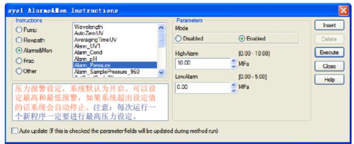 Fig 6、AKTA Explorer的限壓設(shè)定操作5、開始純化:1)在柱子平衡好之后(電導,pH的數(shù)值和變化趨勢穩(wěn)定)即開始上樣了。此時應(yīng)將紫外調(diào)零(Fig 7),選擇Alarm&mon→autozero,exectue。