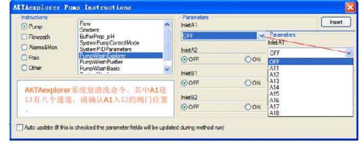 3、清洗及管道準備首先將A泵的進液管道(A1)放入緩沖液或平衡液中,將B泵的進液管道(B1)放入高鹽溶液中,在system control窗口點擊工具欄內(nèi)的manual,選擇 pump→pump wash explorer,選中A1,B1管道為ON, execute。泵清洗將自動結(jié)束。(Fig 4)